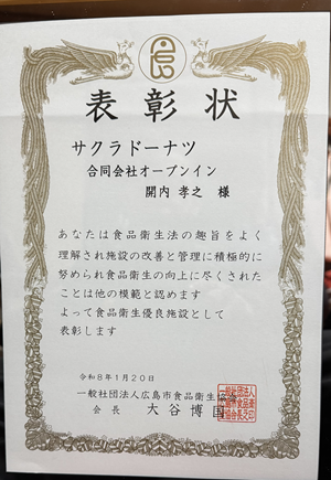 2026-01-20 食品衛生優良施設として当店が表彰されました